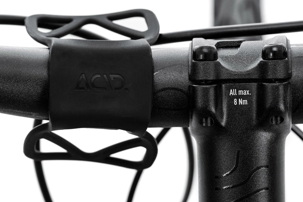 Le support élastique pour téléphone portable PURE d’ACID s’adapte à tous les modèles de smartphones et se monte sans aucun outil : Le support est placé sur le guidon, la sangle inférieure en silicone est tendue autour du guidon et accrochée. Les coins en silicone sont tirés sur les bords du smartphone. Il tient vraiment bien et l’angle d’inclinaison peut être ajusté.