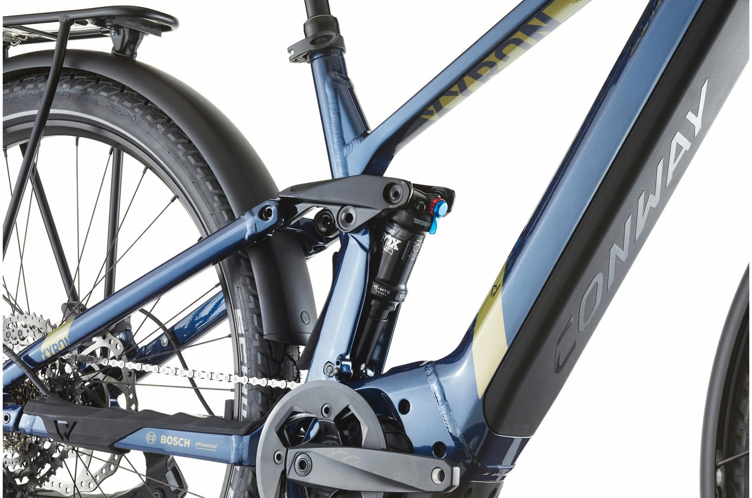 The Conway Xyron SUV 6.9 is probably the most comfortable and yet most suitable E-MTB for everyday use. Equipped with lights, a rear rack and mudguards, it combines the comfort of an e-fully with the practicality of an urban bike. It impresses with a powerful Bosch Performance CX Gen 4 motor. The 750 Wh battery reliably supplies you with the necessary power so that you can enjoy your time on your bike for even longer.