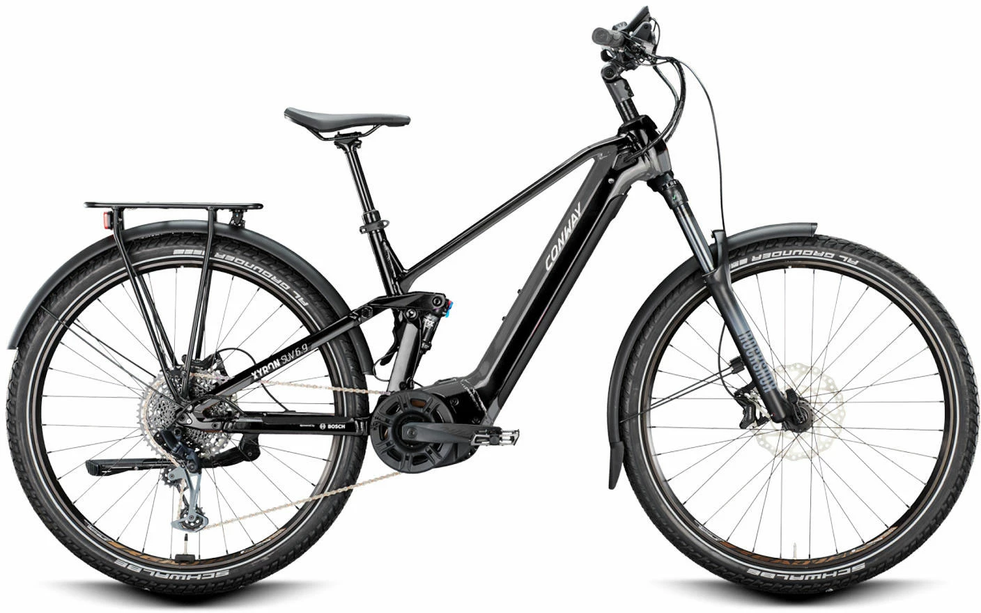 The Conway Xyron SUV 4.9 is probably the most comfortable and yet most suitable E-MTB for everyday use. Equipped with lights, a rear rack and mudguards, it combines the comfort of an e-fully with the practicality of an urban bike. It impresses with a powerful Bosch Performance CX Gen 4 motor. The 750 Wh battery reliably supplies you with the necessary power so that you can enjoy your time on your bike for even longer.
