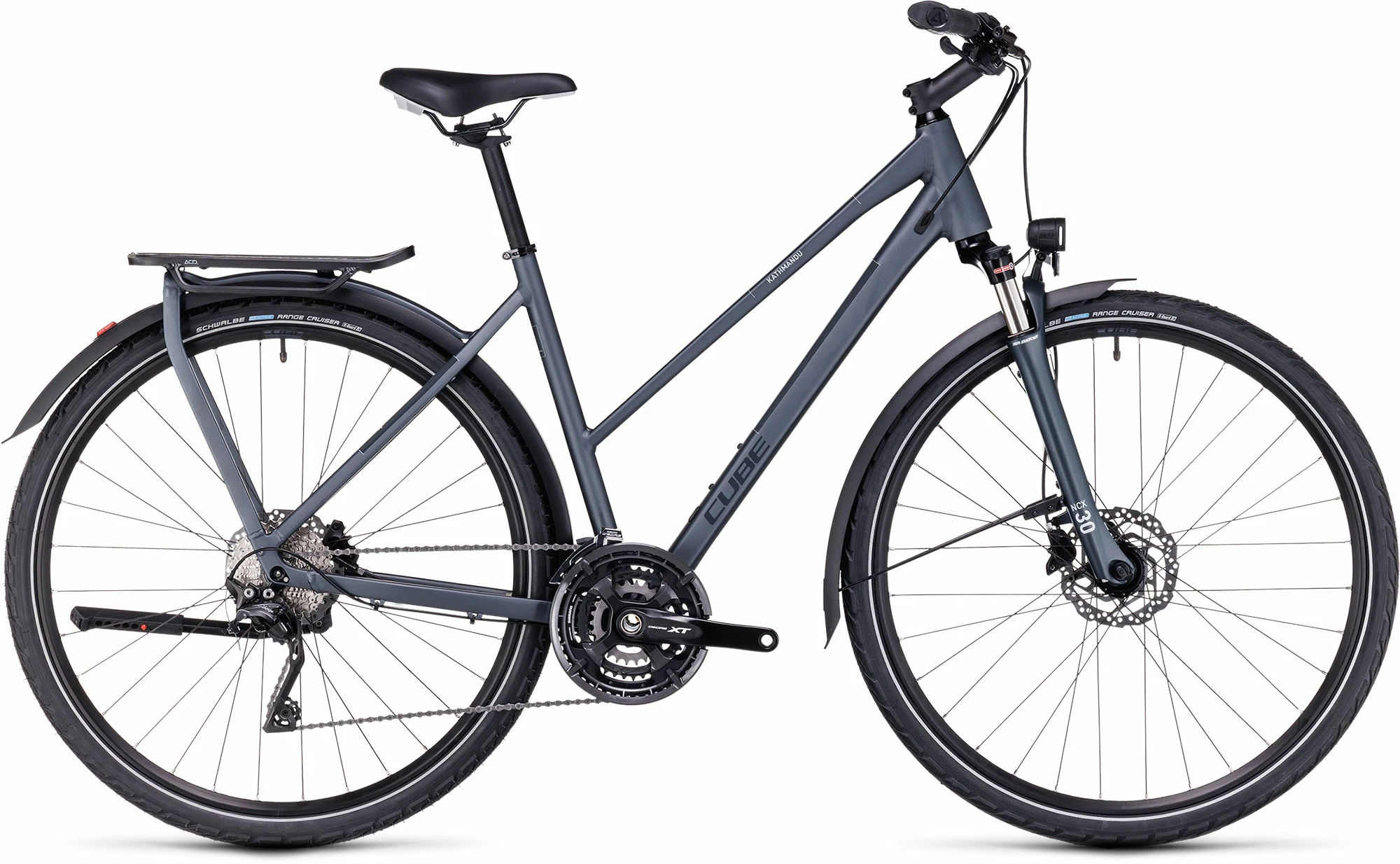 From zipping across town to tackling mountain passes you’ve never ridden before, the Kathmandu EXC is designed to get you there – and back – in comfort and style. CUBE chose Shimano’s 3×10 XT gears for their deserved reputation for reliability and ease of use. Then they added powerful Shimano hydraulic disc brakes, so you know you’re in full control at all times. Finally, they selected an easily adjustable Suntour air suspension fork to take the edge off rough road surfaces. With the Integrated Carrier 3.0 and a full complement of accessories – including mudguards, kickstand and lights – you’ve everything you need. Just jump on and go.