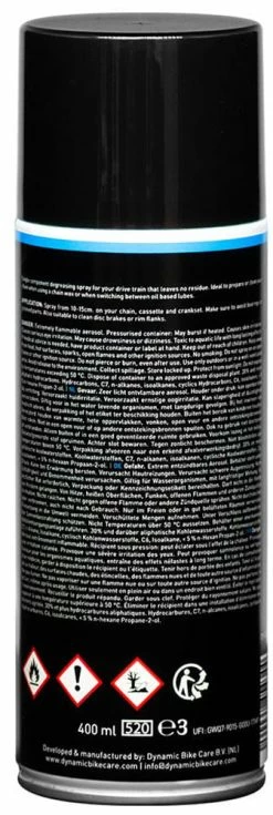 Le spray nettoyant pour chaînes à air comprimé est un dégraissant puissant pour l’ensemble de la chaîne cinématique de ton vélo, dans une bombe aérosol facile à utiliser. Le nettoyant dissout de manière fiable l’huile, la graisse et les autres impuretés. Après utilisation, ta chaîne est comme neuve et prête pour la prochaine lubrification. Dynamic High Pressure Chain Cleaner peut être utilisé pour toutes les parties de ton système de transmission, y compris la chaîne, la cassette, le dérailleur et le dérailleur arrière.