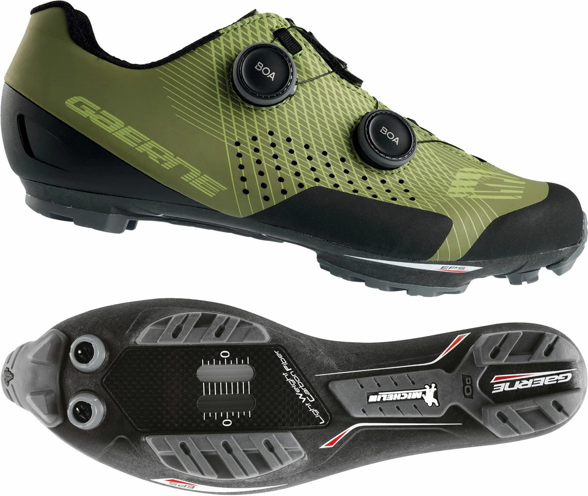 La semelle EPS LIGHT WEIGHT CARBON FIBER MTB SOLE 10.0 associe la technologie Gaerne à l’expertise des concepteurs et des techniciens Michelin pour offrir le juste équilibre entre performance, durabilité, résistance et légèreté. Sa structure est faite de carbone pour assurer une excellente rigidité et une grande puissance lors du pédalage. La bande de roulement en caoutchouc Michelin est un mélange qui combine performance et résistance à l’abrasion – même dans des conditions extrêmes – avec un profil de conception qui offre une excellente adhérence et traction. Le large espace entre les bandes de roulement permet un meilleur auto-nettoyage et une évacuation instantanée de la boue.
