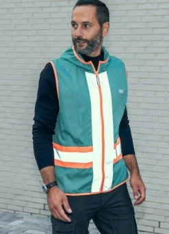Un super gilet, à porter au dessus de vos vêtements. Le fait qu’il soit déperlant et qu’il possède une capuche est un gros plus. Ses larges bandes réfléchissent très bien la lumière des phares ou des lampadaires et permettent d’être facilement visible ! Quant à nous, on le porte même en journée !