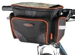 Sacoche de guidon emboîtable pour équipement photographique ou autres accessoires avec compartiments rembourrés, sangle de transport et bandes réfléchissantes.