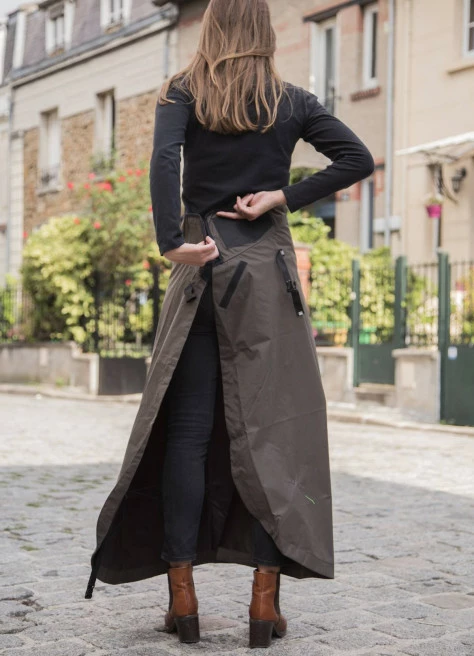 Des attaches au niveau de la jambe (voir seconde vidéo ci-dessous) permettent d’attacher la jupe de pluie pour éviter qu’elle ne s’envole en roulant