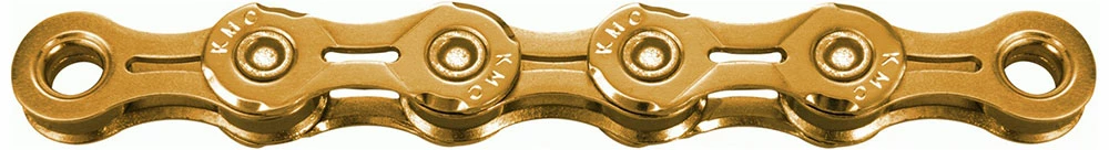 La chaîne super légère X11EL Ti-N 11 vitesses de KMC sans dépendance du sens de marche et avec un revêtement de surface en nitrure de titane doré pour les systèmes de changement de vitesse 11 vitesses.