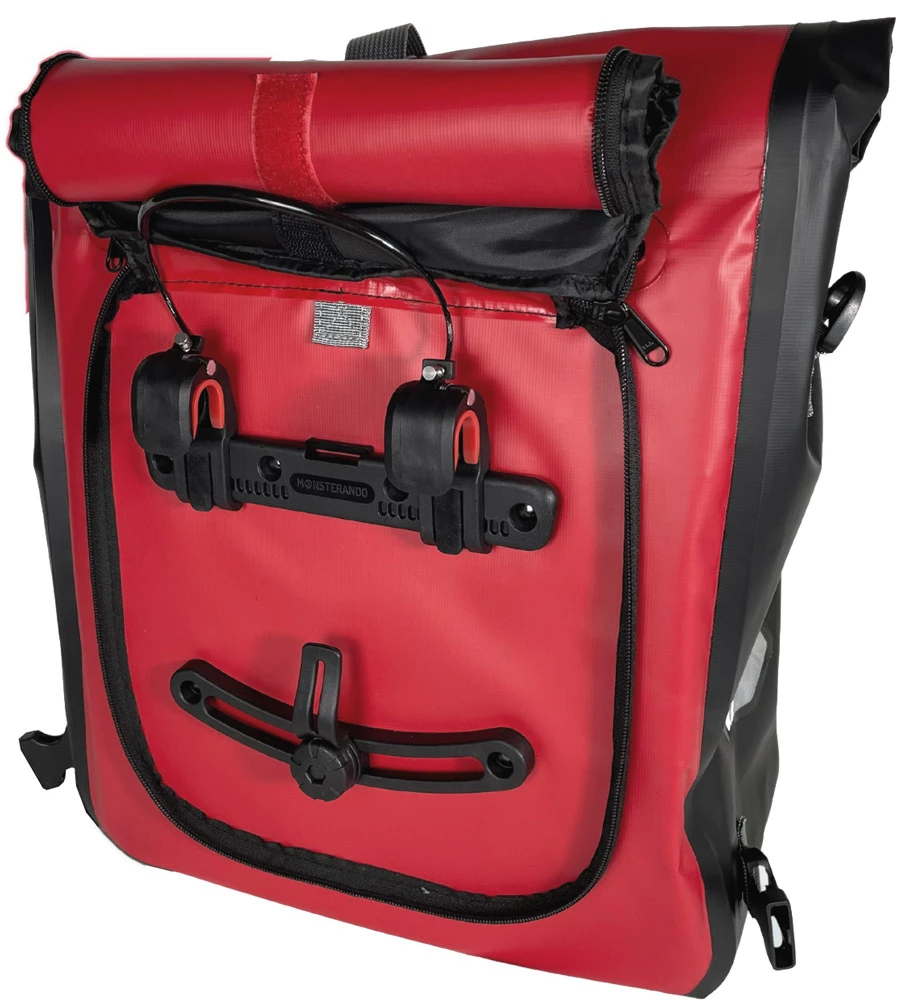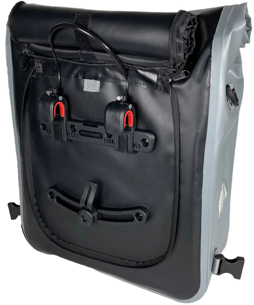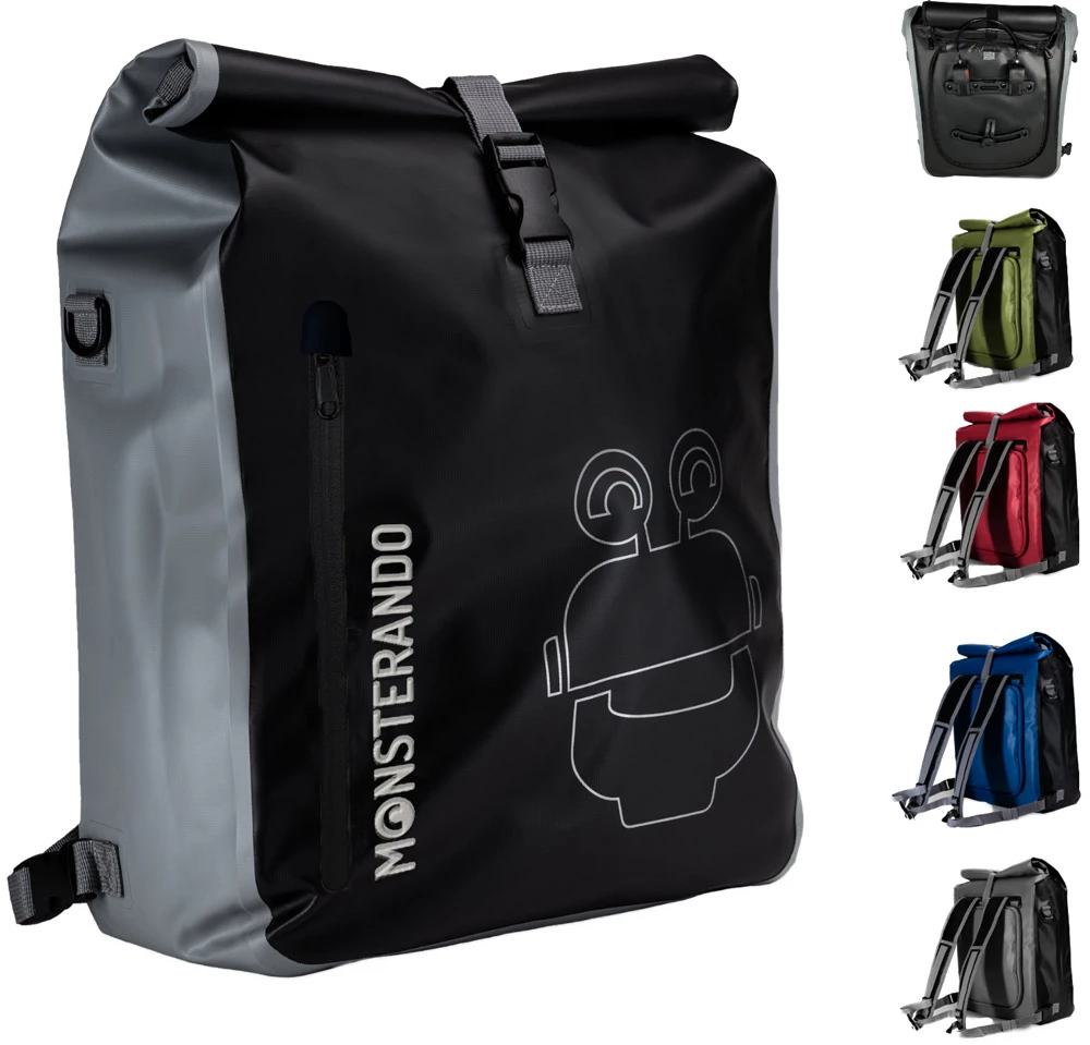Des crochets d’accrochage te donnent la possibilité de fixer facilement le sac sur ton porte-bagages. Le support convient aux porte-bagages avec une épaisseur de tube de 8 à 21 mm et se fixe et se détache rapidement et facilement pour une fixation sûre et solide. Le support pour le porte-bagages est également dissimulé sous un compartiment à fermeture éclair que tu peux ouvrir rapidement et facilement en cas de besoin. La sacoche de vélo MONSTERANDO 3 en 1 est 100% étanche et te garde au sec sous la pluie, grâce à un matériau PVC robuste et de haute qualité.