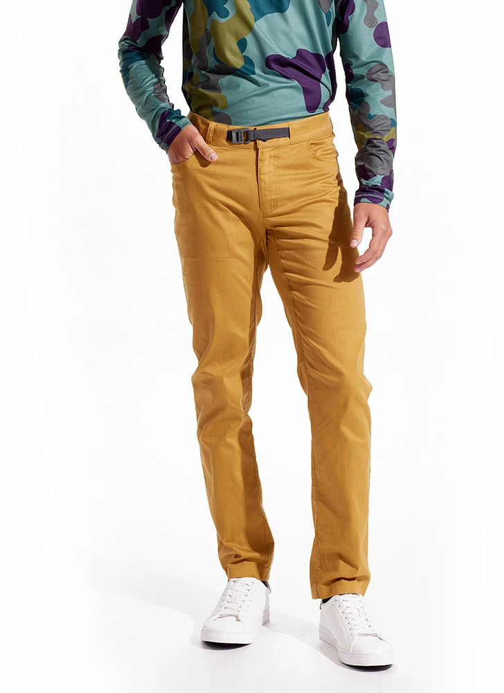 Ce pantalon pourrait facilement passer pour un jean, notamment grâce au coton biologique contenu dans le tissu. Pour le rendre résistant et extensible, le coton a été combiné avec du nylon, de sorte que le pantalon convient aussi bien pour les courses en ville que pour les trajets domicile-travail.