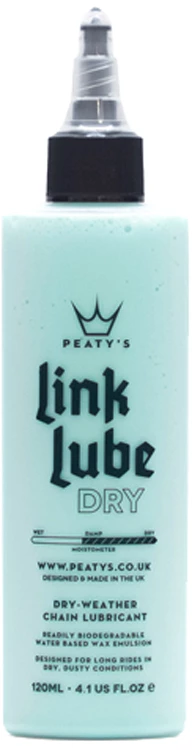 Le lubrifiant pour chaîne facilement biodégradable LinkLube Dry Weather de Peaty’s contient une combinaison unique d’agents actifs de cires dissoutes dans une émulsion à base d’eau pour assurer une chaîne durable, propre et silencieuse pour des conditions sèches et poussiéreuses à légèrement humides.