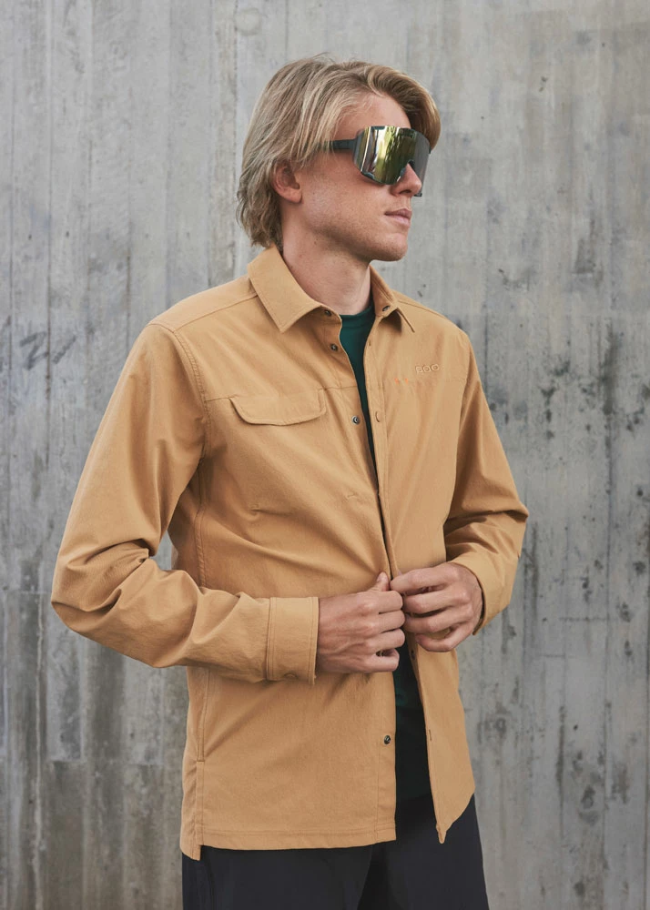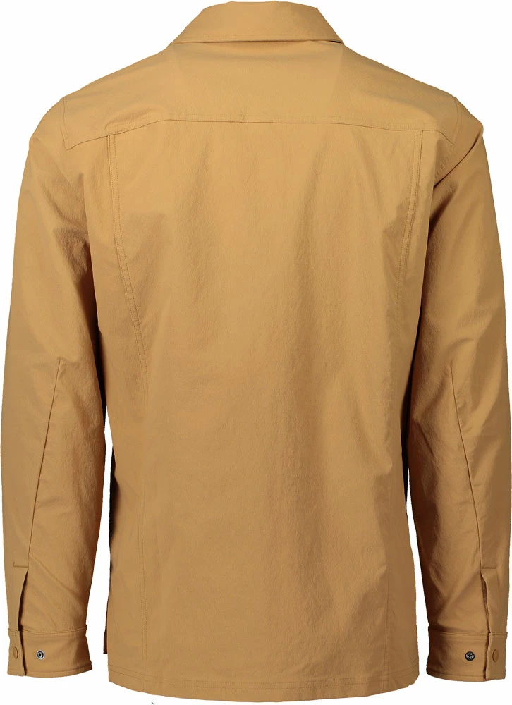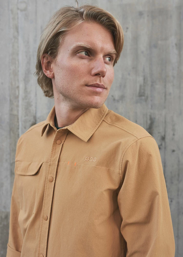 The shirt is easy to wear and has a loose fit for a relaxed look over a base layer. The sleeves are loose enough to wear elbow pads underneath and has a fluorocarbon-free DWR treatment to keep light rain showers out. Snap buttons and an embroidered POC logo highlight the casual style, while a chest pocket and integrated sunglass holder add functionality.