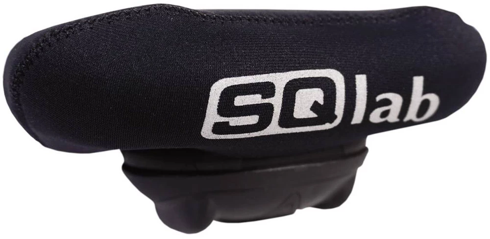 Protège-selle en néoprène avec logo SQlab réfléchissant à l’arrière de la selle. Disponible en trois tailles (S=Race, M=Trekking, L=City / Comfort).