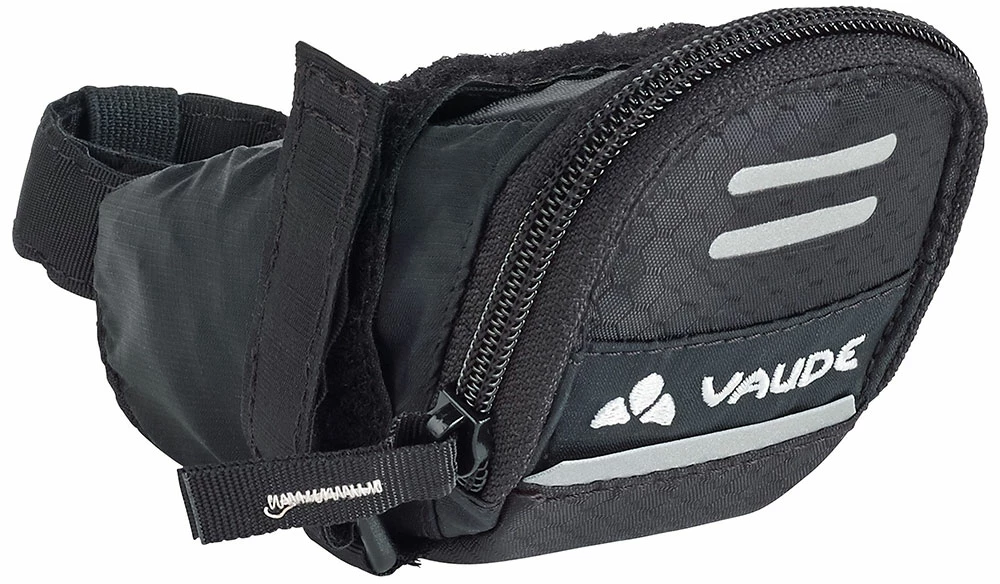 Le sac de selle Race Light M de Vaude, ultra-léger et de grand format, offre de l’espace pour votre trousse d’urgence grâce à deux petites poches intérieures.