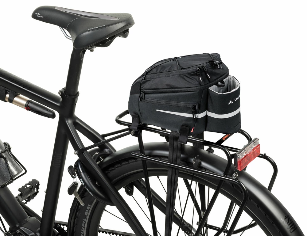 Porte vos bagages ! Cette sacoche pour porte-bagage avec une contenance de 9+2 litres et porte-gourde, peut être fixée grâce à des velcros.