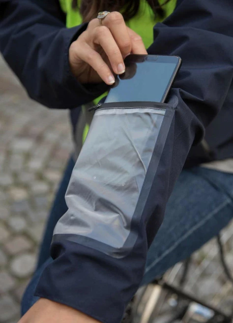 Deux poches : une poche tactile pour accéder rapidement à votre smartphone sans l’exposer et une dorsale, inspirée des maillots de cyclisme, facilement accessible en roulant