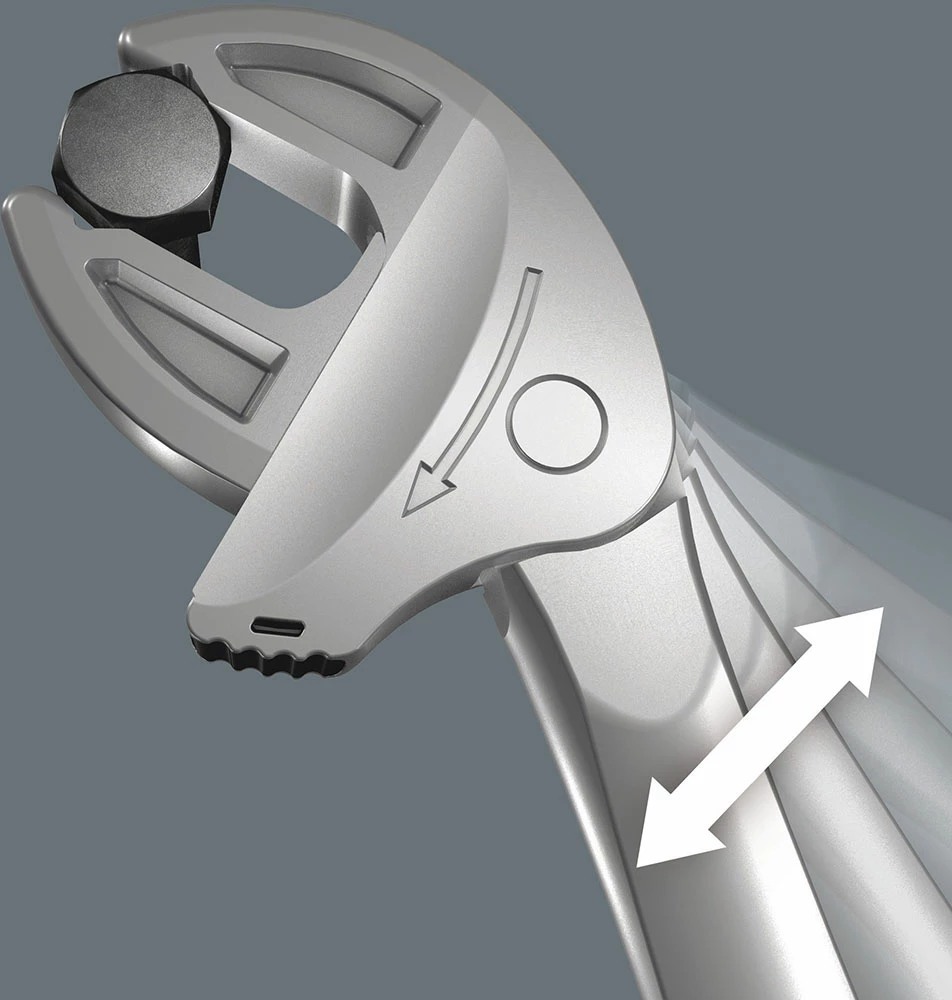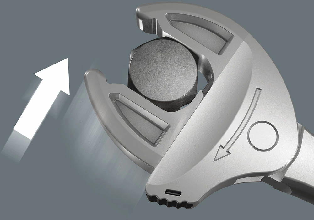 De nombreux utilisateurs souhaitent un outil de vissage universel avec un éventail d’applications le plus large possible. Un seul outil devrait suffire pour plusieurs dimensions métriques et impériales. Il faudrait qu’il s’adapte automatiquement aux différentes tailles de vis. Il faudrait qu’il agrippe fermement sans rien endommager et permette de travailler rapidement. Les mors parallèles réglables en continu remplacent plusieurs clés mixtes de dimension unique. La taille nécessaire se règle sans paliers automatiquement au contact des vis ou des écrous hexagonaux. Le mécanisme de levier intégré serre fermement la vis ou l’écrou entre les mors, ce qui réduit considérablement le risque de dérapage ou d’endommagement de la pièce. Grâce à la fonction cliquet, le vissage se fait rapidement, uniformément et sans désengagement de la clé. Les prismes permettent un angle de reprise de seulement 30°. La conception à une seule branche associée à la fonction cliquet et au prisme permet de travailler même dans les espaces réduits.